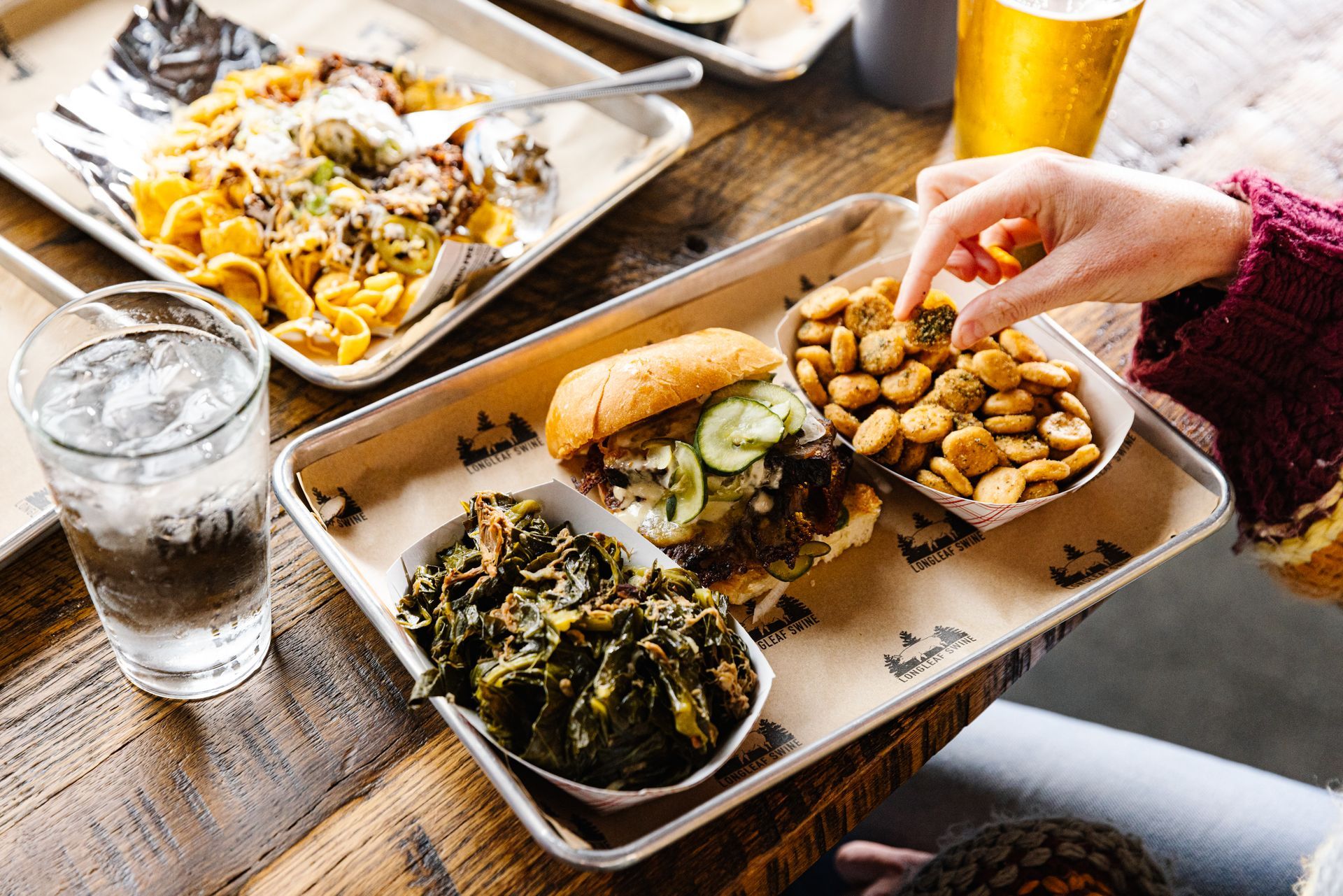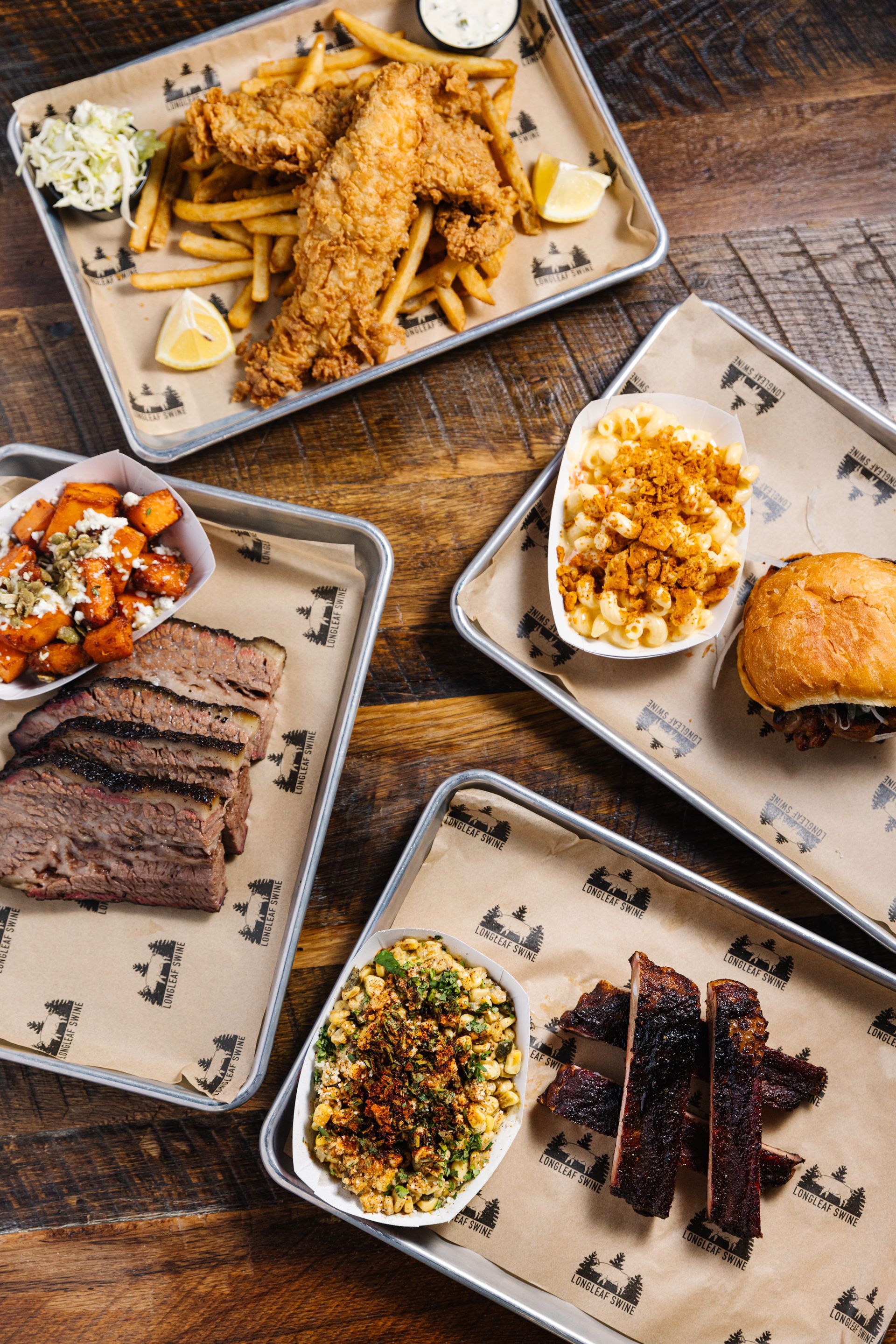 1/2 POUND BRISKET, PULLED PORK & SPARE RIBS; 2 CHICKEN QUARTERS CHOICE OF 3 LARGE SIDES; HOUSE PICKLES & PORK RINDS